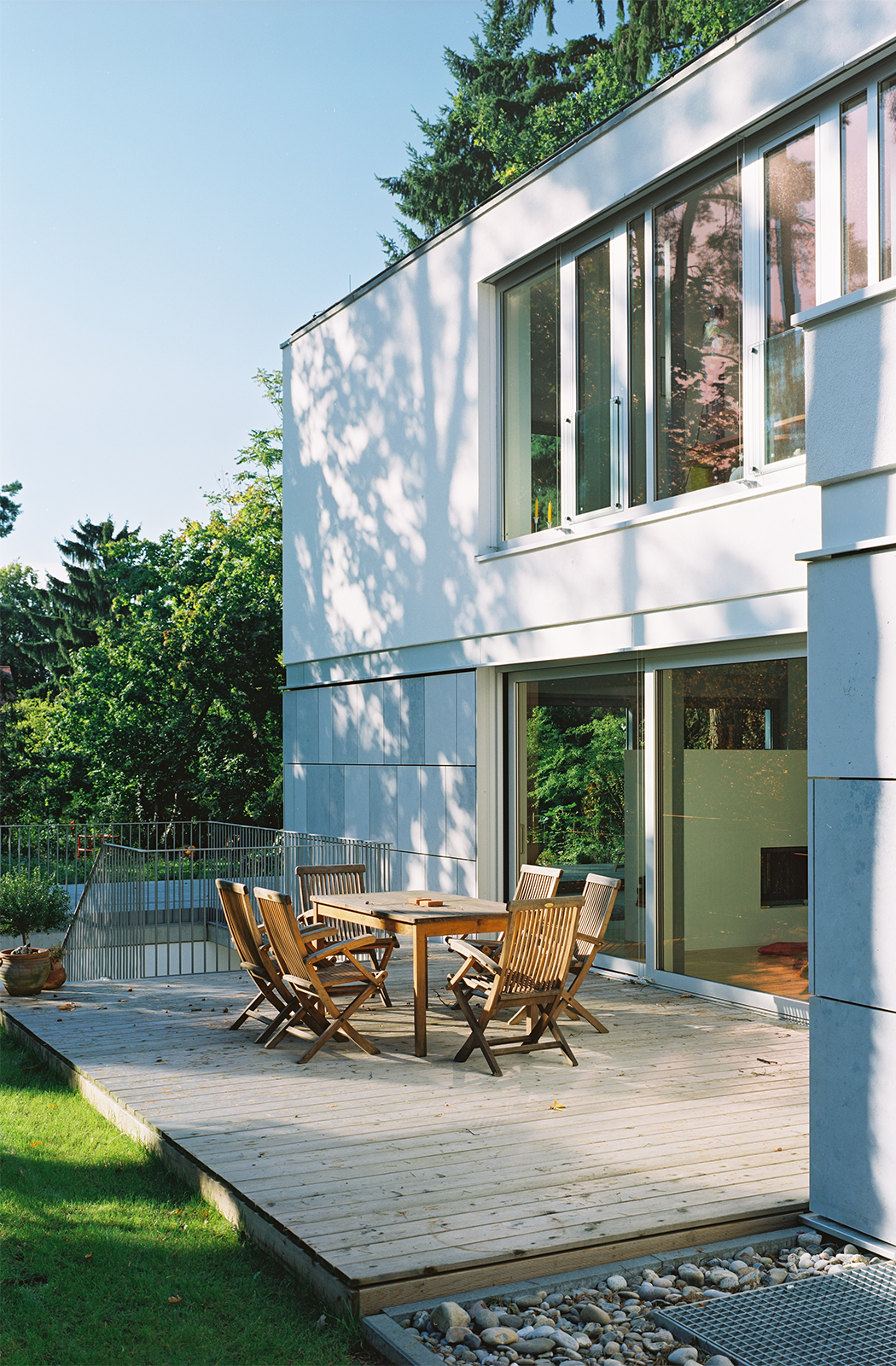 Konstruktion, Gestaltung und Technik folgen einem ganzheitlichen Konzept: Ein optimiertes A/V-Verhältnis, eine hochgedämmte und dichte Gebäudehülle und der integrierter Sonnenschutz sorgen für geringe Energieverluste. Geheizt wird über Erdwärme, die Elektroverteilung erfolgt über ein modernen Bussystem, Regenwasser wird gesammelt und nachgenutzt.